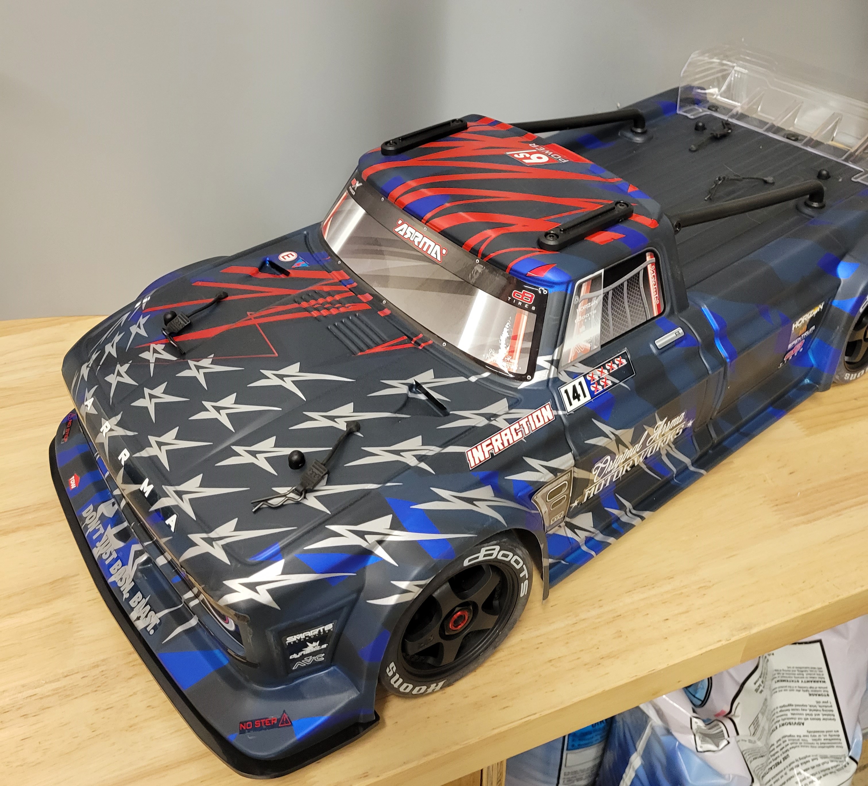 The advanced 'all-road' 4 Wheel Drive Infraction 6S is a high speed drift capable vehicle available from ARRMA RC. The Infraction is capable of 80mph+ with an out of the box speed of 65-70mph. This unique vehicle also comes with a hand brake pre installed for the tightest drifts.